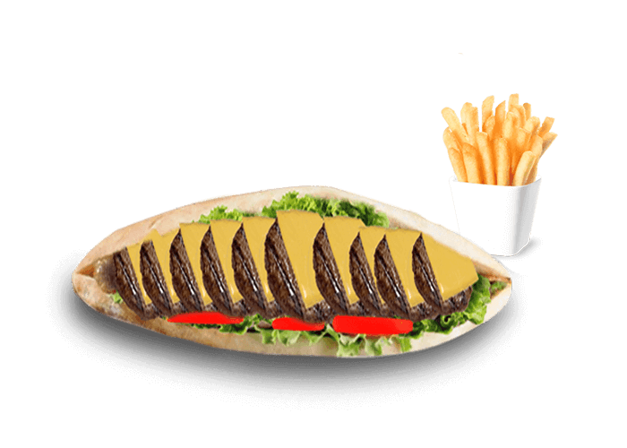 Pain burger de 16cm, 2 steaks 180g, oeuf, raclette, salade, tomates, oignons + Frites.